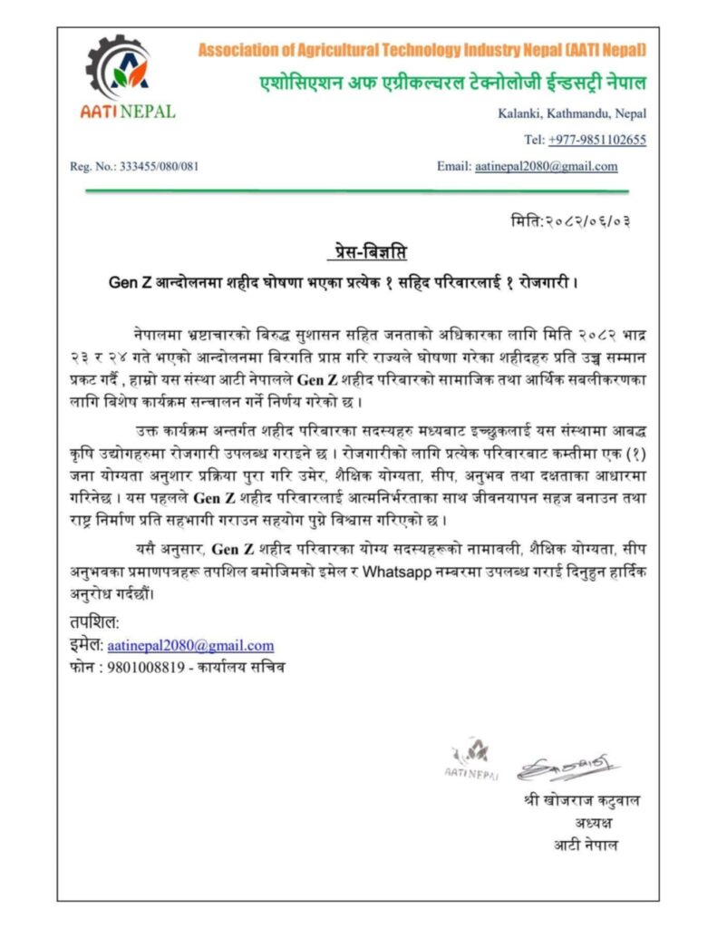 काठमाडौँ – एशोसिएशन अफ एग्रीकल्चरल टेक्नोलोजी ईन्डसट्री नेपाल (आटी नेपाल) ले Gen Z आन्दोलनमा शहीद घोषणा भएका प्रत्येक परिवारलाई रोजगारी उपलब्ध गराउने घोषणा गरेको छ।
