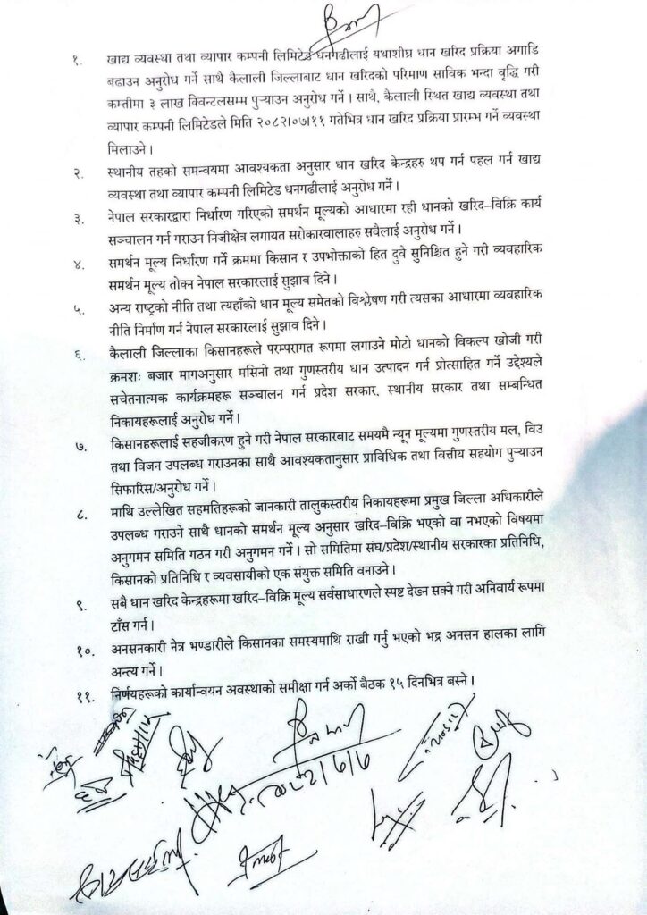 बैठकले खाद्य व्यवस्था तथा व्यापार कम्पनी लिमिटेड धनगढीलाई यथाशीघ्र धान खरिद प्रक्रिया अघि बढाउन अनुरोध गरेको छ। साथै, यस वर्ष कैलाली जिल्लाबाट धान खरिदको परिमाण साबिकभन्दा वृद्धि गरी कम्तीमा ३ लाख क्विन्टलसम्म पुर्याउन आग्रह गरिएको छ।