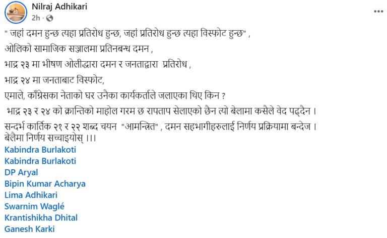 अधिकारीले लेखेका छन् सन्दर्भ कार्तिक २१ र २२ शब्द चयन आमन्त्रित दमन सहभागीहरुलाई निर्णय प्रक्रियामा बन्देज। बेलैमा निर्णय सच्चाइयोस्। उनले आमन्त्रितहरूलाई निर्णय प्रक्रियाबाट बाहिर राख्नु अनुचित भएको टिप्पणी गर्दै चेतावनीको शैलीमा लेखेका छन् जहाँ दमन हुन्छ त्यहाँ प्रतिरोध हुन्छ जहाँ प्रतिरोध हुन्छ त्यहाँ विस्फोट हुन्छ।