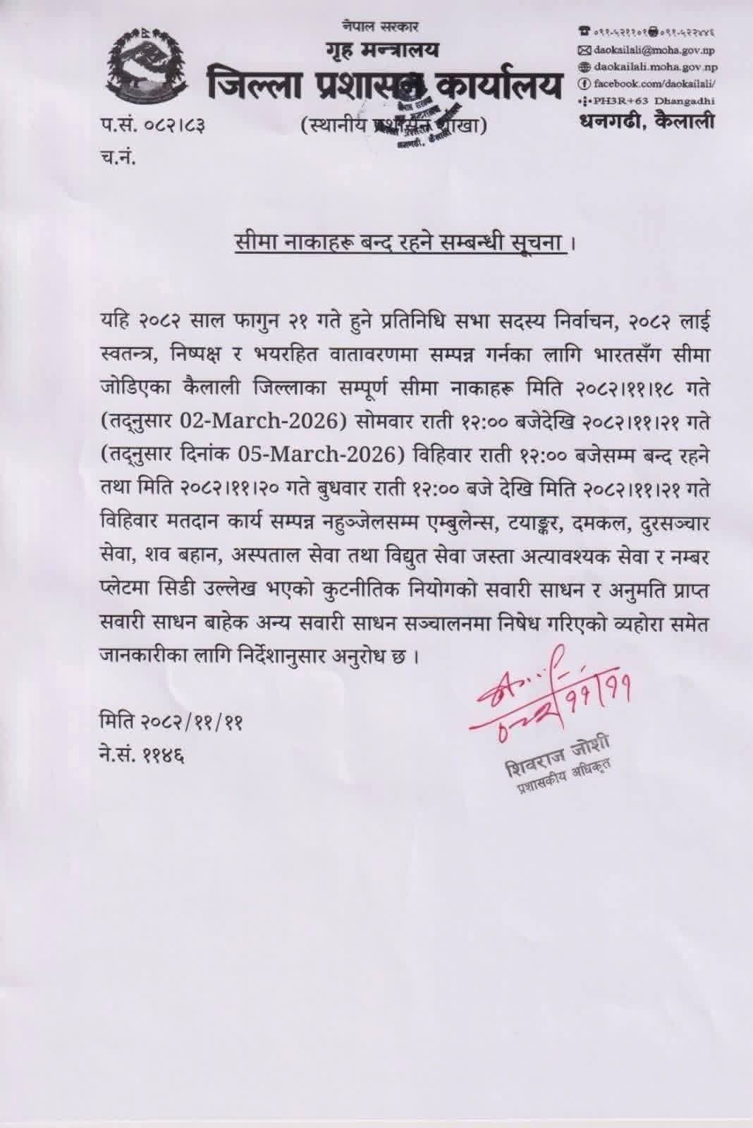 कार्यालयद्वारा जारी सूचनाअनुसार २०८२ साल फागुन २२ गते हुने प्रतिनिधि सभा सदस्य निर्वाचनलाई स्वतन्त्र, निष्पक्ष र भयमुक्त वातावरणमा सम्पन्न गर्न भारतसँग जोडिएका कैलाली जिल्लाका सबै सीमा नाकाहरू बन्द गरिने भएको हो।